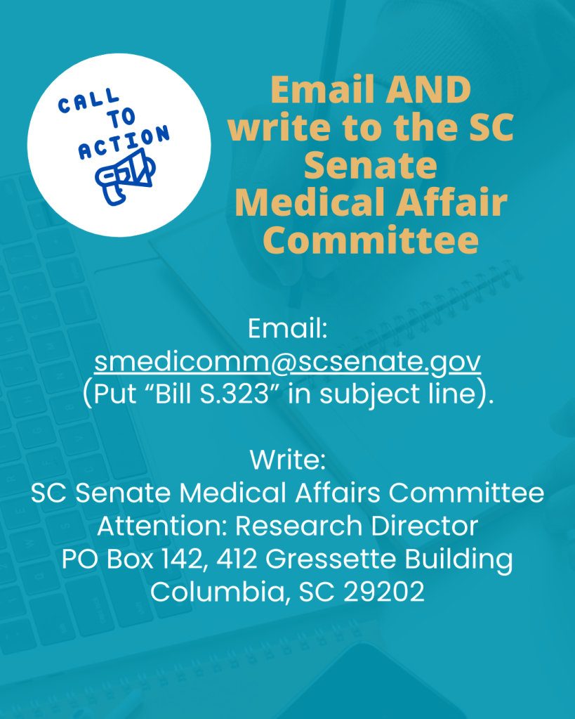 On October 1, the South Carolina Senate Medical Affairs Subcommittee will hold a hearing on Senate Bill S.323, also known as the “Unborn Child Protection Act.”<br>This is not just another abortion ban. S.323 would outlaw all abortions with no exceptions for rape, incest, or fatal fetal anomalies. It seeks to establish legal “personhood” for embryos and fetuses — even before implantation.<br>This could mean that anyone who accesses abortion care in South Carolina could be charged with homicide and potentially face the death penalty if convicted.<br>“Personhood” laws like this have also been used to target contraception (such as Plan B and IUDs) and restrict fertility treatments like IVF.<br>S.323 is one of the most extreme and dangerous attacks on reproductive freedom in modern history.
